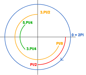 La méthode arc(x, y, r, angleDepart, angleFin) crée un arc de cercle centré en position (x,y) avec un rayon r entre 2 angles exprimés en radians (donc entre 0 et 2*PI qui correspondent à 0 et 360°).