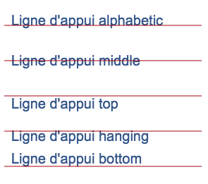 La propriété textBaseline contient le type de ligne d'appui du texte. Par défaut, la valeur est alphabetic avec un texte qui s'appuie sur la ligne principale d'écriture. Voici quelques exemples d'appui :